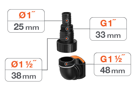 В комплект поставки входит универсальный патрубок, который позволяет соединить насос со шлангами диаметрами 1", 1 1/4'' и 1 1/2" или разъемом G1".
